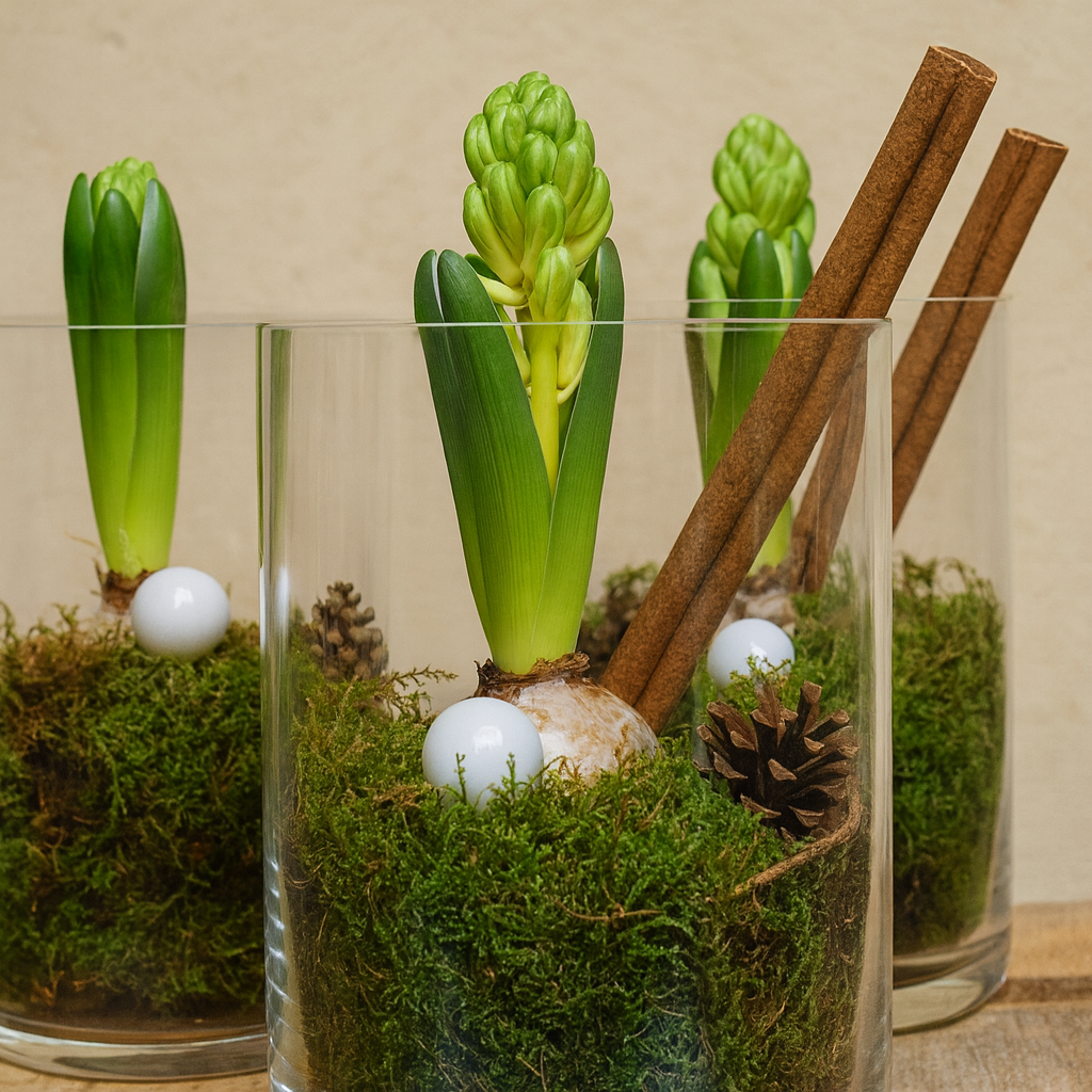 Hyasintti istutettuna kirkkaaseen lasimaljaan sammaleen, käpyjen ja koristeellisten yksityiskohtien kera.