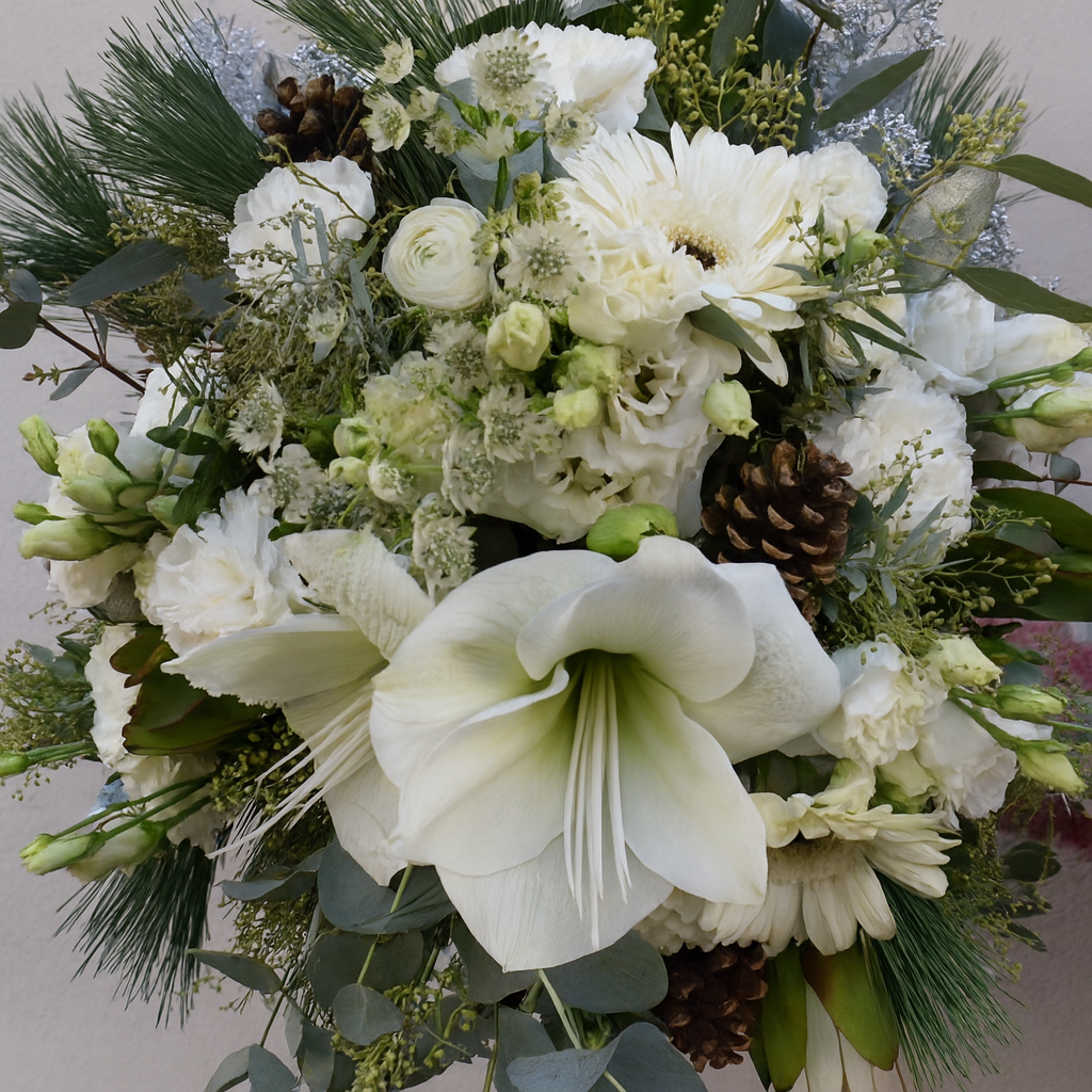 Valkoisessa joulukimpussa sesongin kauneimpia kukkia ja vihreitä. Lajikkeet vaihtelevat saatavuuden mukaan. Kuvassa iso koko.