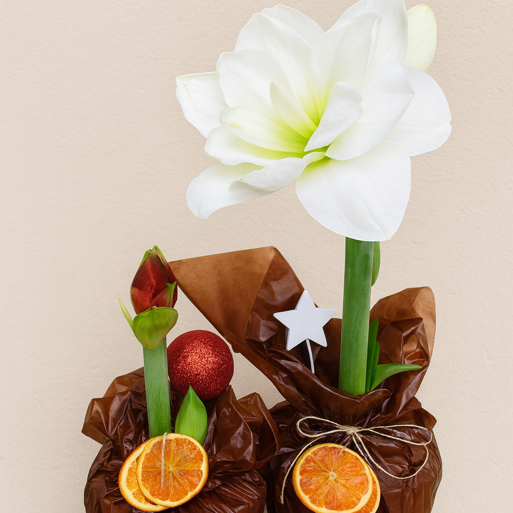 Upeat kotimaiset ruukkuamaryllikset kauniissa paperissa ja koristeilla. Koristeet vaihtelevat saatavuuden mukaan.