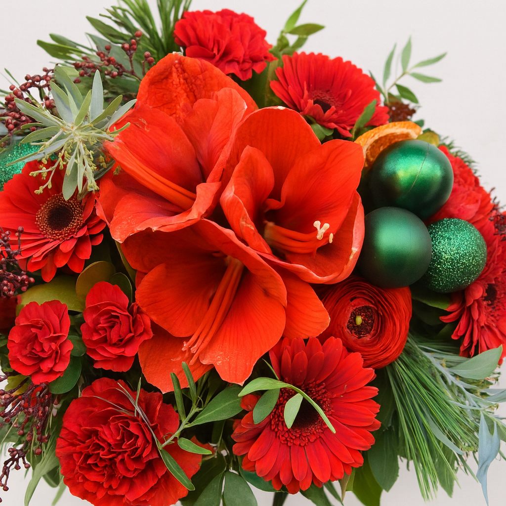 Näyttävä ja muhkea joulukimppu punaisen eri sävyissä. Koristeena sesongin vihreitä, havuja ja joulukoristeita. Kuvassa pienin koko. Kukat ja koristeet vaihtelevat sesongin mukaan.